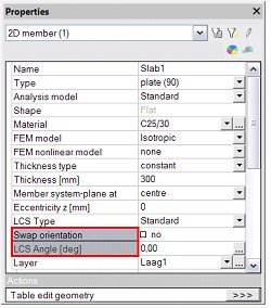 The sense of the z axis can be inverted by selecting the option ‘Swap orientation’ in the Properties menu of the 2D member. Also an ‘LCS angle’ can be entered to define a rotation of the local x and y axes around the local z axis: