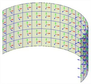 Each mesh element also has its own local co-ordinate system. Also here the z axis is always perpendicular to the element plane. For the mesh elements of a curved 2D member, we can find for instance the following result: