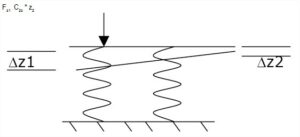 The method according to Winkler is the most dispersed and simplest method. With this model, we start with a uniform settlement of the plate. A load F1z will lead to a deformation Dz1, so from this a subsoil constant C1z can be determined: