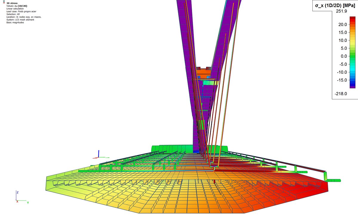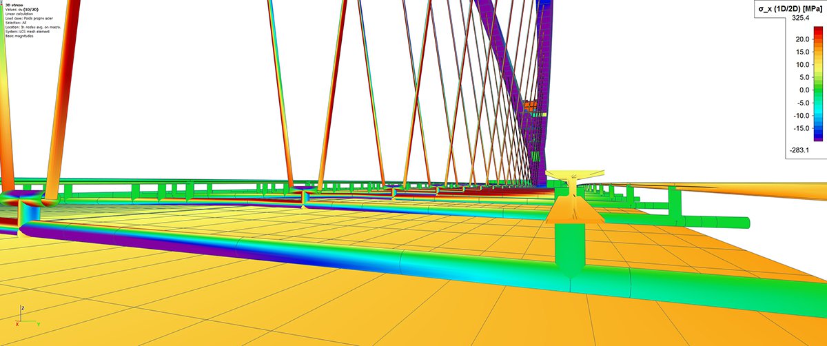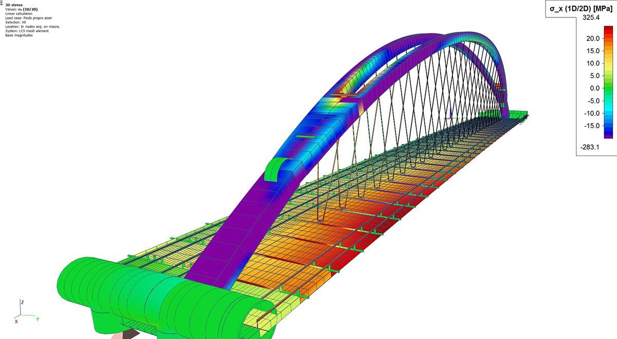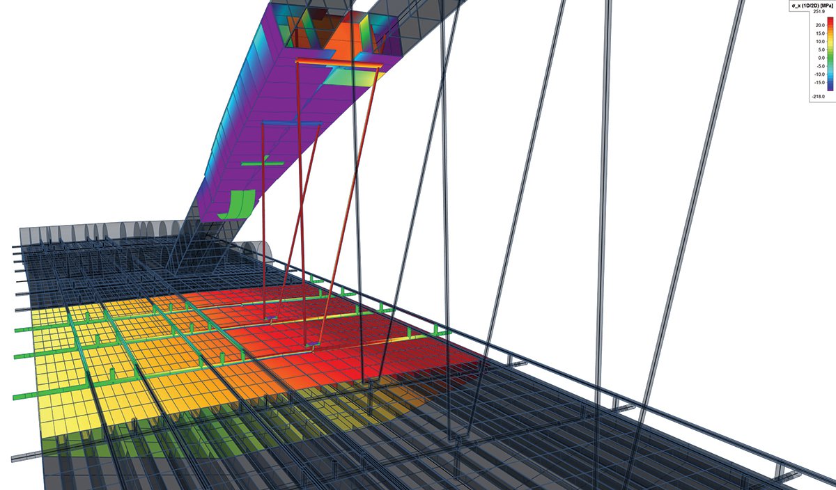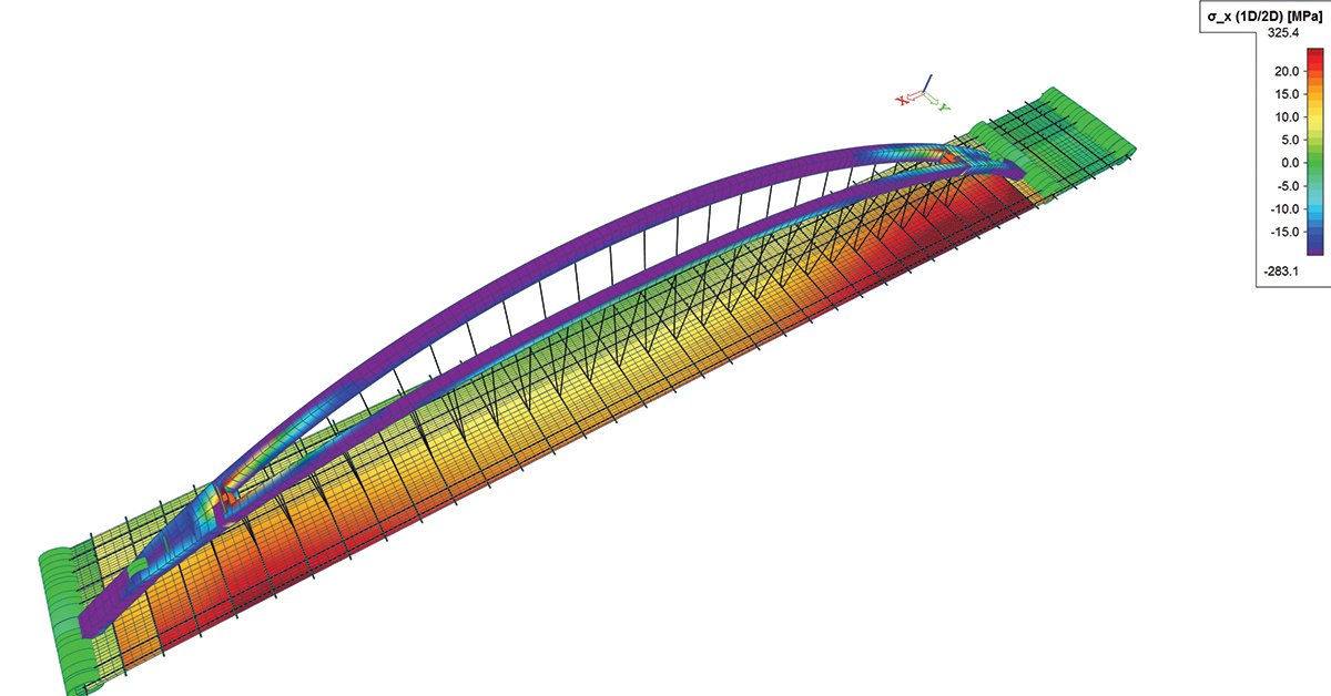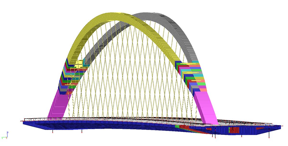 Możliwość wprowadzania I stosowania wlasnych przekrojów była wielką zaletą do oceny wpływu pokładu na globalną odpowiedź konstrukcji. Analiza stateczności, w tym postaci wyboczeniowych, zostały wykorzystane przy analizie II rzędu dla łuków. Analiza dynamiczna pomogła ustalić odpowiedź całego mostu w stanie użytkowalności czyli odpowiedź na oddziaływanie ruchem drogowym, tramwajowym i wiatrem.